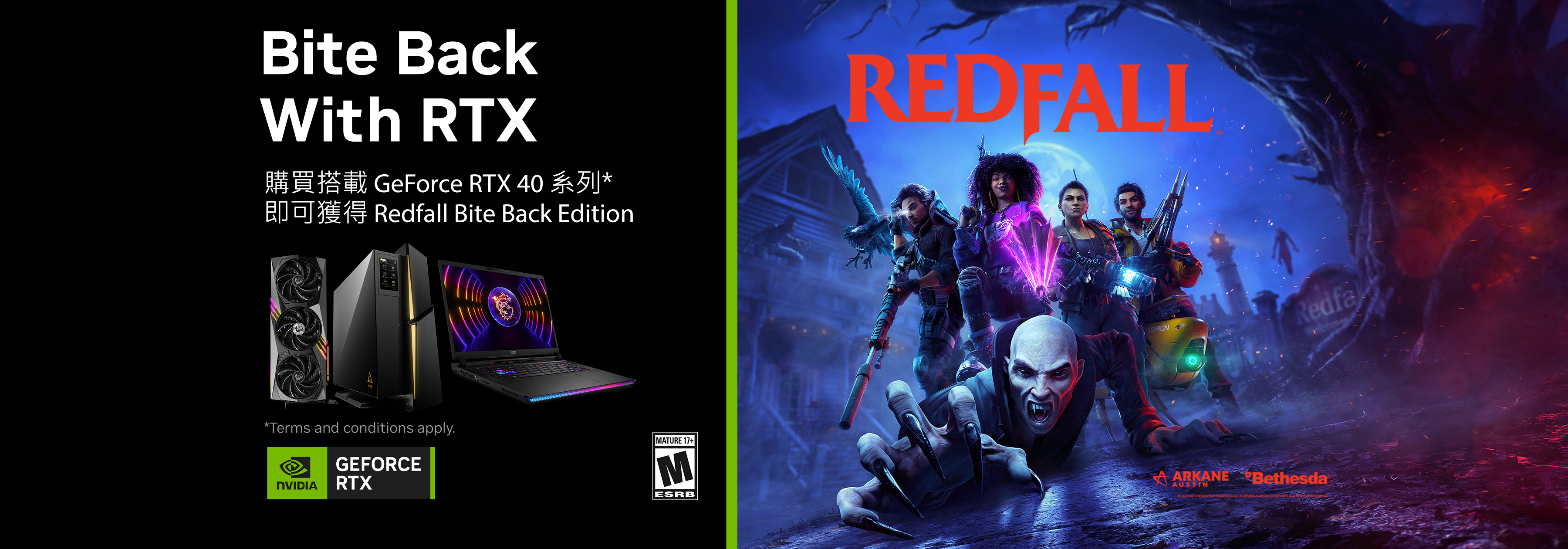 在限定時間內,購買符合條件的 GeForce RTX 4090、4080 或 4070 Ti 桌上型電腦或 GPU,或配備 RTX 4090 GPU 或 4080 GPU 的筆記型電腦,即可獲得 Redfall Bite Back Edition(價值 $99 美元)。*