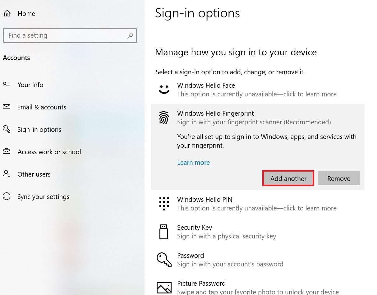5. 如果你想加入另一個指紋,請點擊【Windows Hello指紋】並點擊【新增另一個】,然後再重覆步驟3和步驟4。