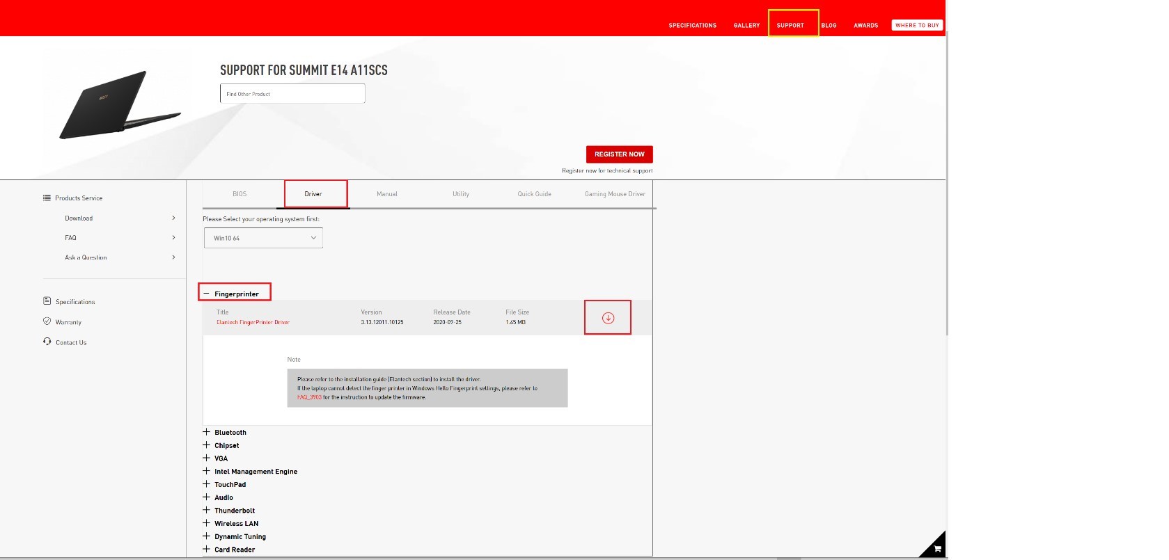 1. 進入【MSI網站】,找到你的筆記型電腦型號,點擊【支援】並找到【驅動程式】,然後選擇【指紋】並下載驅動程式。