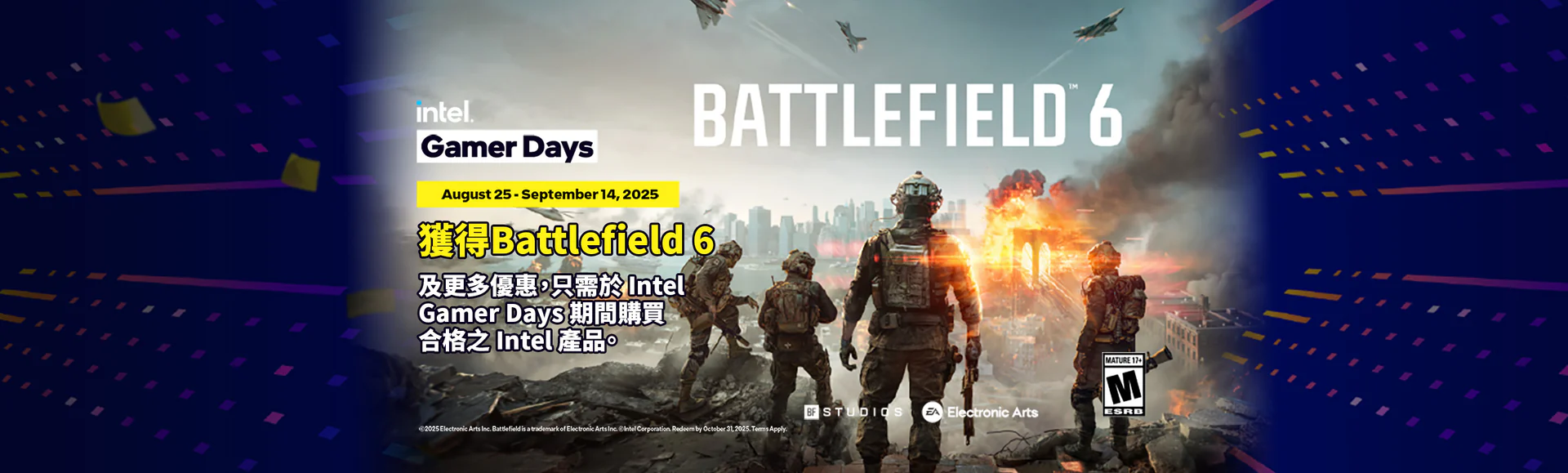2025/8/25 – 2025/9/14 獲得Battlefield 6 及更多優惠,只需於 Intel Gamer Days 期間購買合格之 Intel 產品。(限量提供,送完為止)