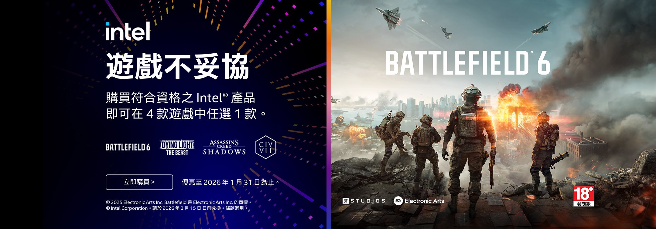 2025/11/1 – 2026/1/31 只需於 Intel Holiday 期間購買合格之 Intel 產品,即可即可在4款遊戲中任選1款 。(限量提供,送完為止)
