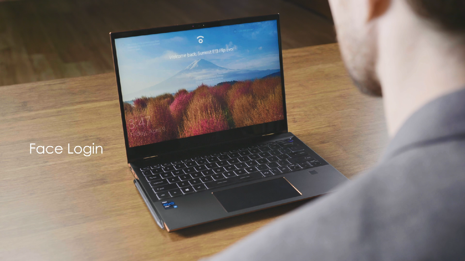 你剛進入一間會議室,打開筆電蓋並使用臉部辦識登入,你打開在準備到會議室時所收到的郵件,並查看最新訊息。這時候,你的客戶進入會議室,你蓋上筆電並與他進行交談。談話結束後,你簡單地打開筆電蓋,立即使用面部辦識登入,並繼續閱讀訊息。在會議期間,你使用同事的電腦進行簡報,此時客戶詢問你一些資訊,但這些資訊存在你的筆電中,你回到你的筆電並將手指放在指紋傳感器,立即喚醒與解鎖。