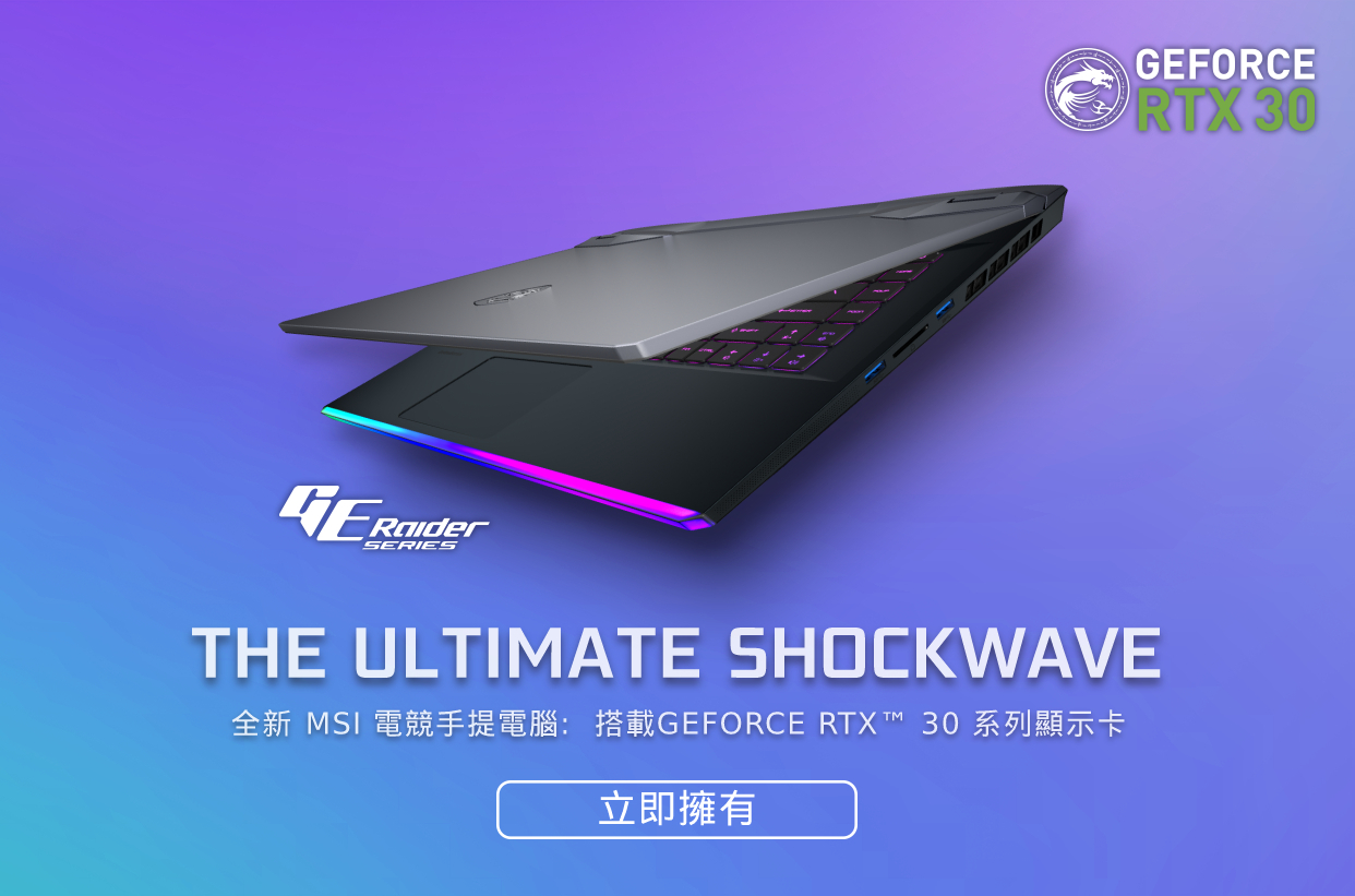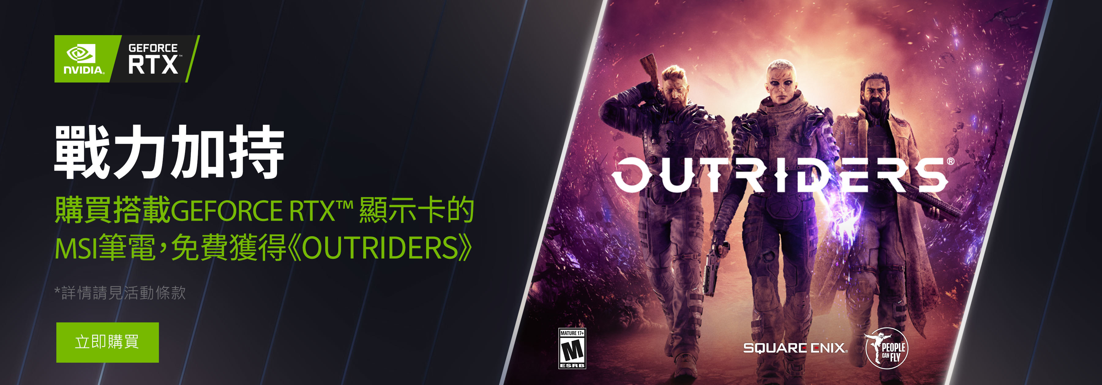 活動期間,選購合乎活動資格的MSI電競筆電,即可免費兌換《先遣戰士》(Outriders), NVIDIA GeForce RTX 將為你帶來極致順暢的遊戲體驗!
