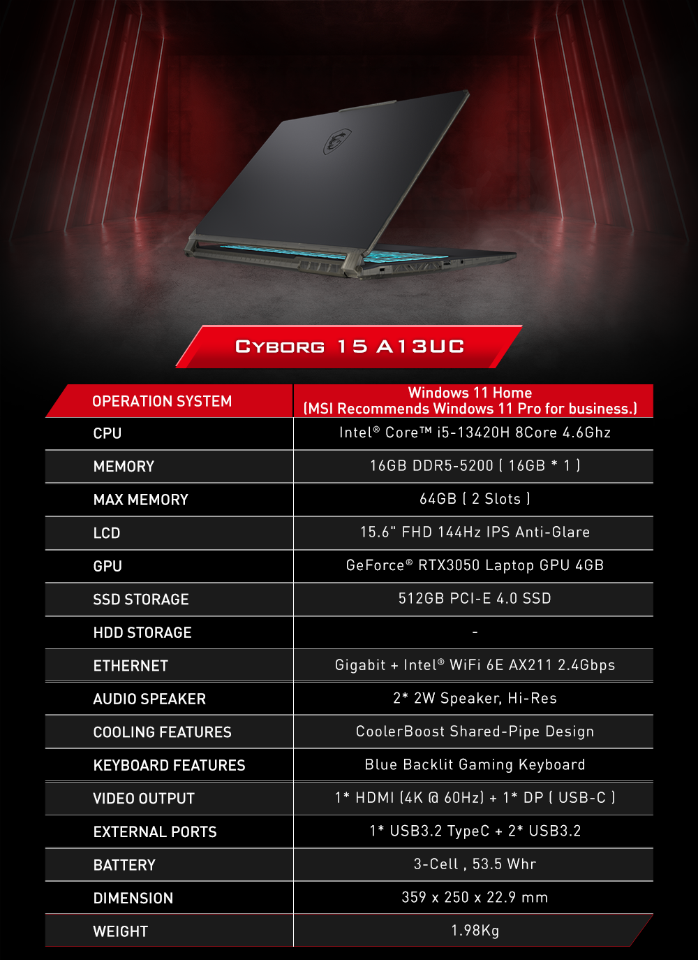 With a 1.98kg wieght and 21.95mm thinness, Cyborg 15 A13U is perfect for on-the-go gaming. The integration of aluminium material on cover gaurantees a smooth, high-quality feel on first contact and keeps it light.
