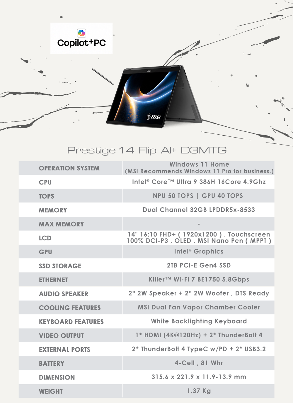 The Perfect Balance of Performance, Efficiency, and AI.Powered by the latest Intel® Core™ Ultra X9 Series 3 processor, the Prestige Series delivers fast AI acceleration, efficient performance, and smooth responsiveness when working or creating. Its ultra-light, portable design helps you to stay productive and energized throughout your day.