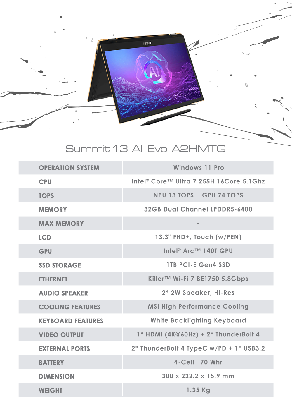 Unlock advanced productivity tools, text and image creation. Summit series has the latest Intel® Evo™ Edition certification and comes powered by an Intel® Core™ Ultra 7 processor 255H, making intensive computation seem easy and efficient. The latest Integrated NPU also powers more workloads; it is the best choice to accelerate AI programs for long-sustained, power moderate, intensive applications, levanting your workflow to new heights.