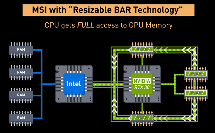 過去,CPU單一次向GPU 存取的內容被限制在 256 MB。 儘管現代遊戲以其出色的遊戲效果,即時渲染和高解析而迅速發展,但在傳統設計下,若資料量超過這個大小,就必須頻繁的在 CPU 和 GPU 之間來回溝通,整體運算效率低,影響遊戲FPS呈現。 Resizable Bar技術極大地提高了CPU和GPU之間的運算效率。 現在,CPU可以完全存取整個VRAM並減少與GPU的來回溝通,而不必通過共享內存作為緩衝區進行協作,並且數據傳輸將更加快速且完整。 <查看更多>