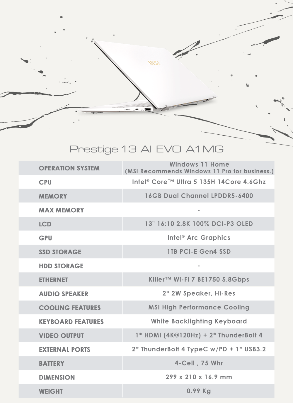 Prestige 13 AI Evo A1M是一款輕巧便攜的筆記型電腦,纖薄機身保有高生產力與便攜性。機身採用半固態射出成型ATT(Advanced Thixomolding Technology)製成,優化模具注射過程,實現無縫金屬機身,重新定義了強度、耐久性和高品質。